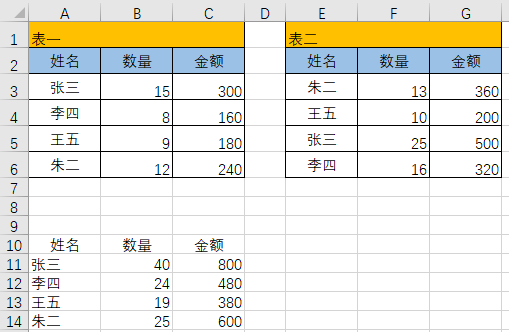 下图中是两个数据表,怎样利用合并计算将“表一”和“表二”数据进行汇总呢?