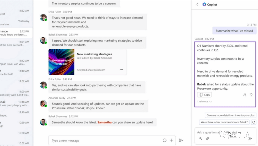 Copilot的“Catch up”功能可以帮你挑出最有信息量的那些,并总结出对应的要点,比如一封是某某下属进行的财务业绩汇报、一封是关于某业务销售额下降的讨论等等那感觉,就跟请了一个帮你分门别类的秘书一样——你就不用自己费心筛选,直接从这几封开始批阅就行了。