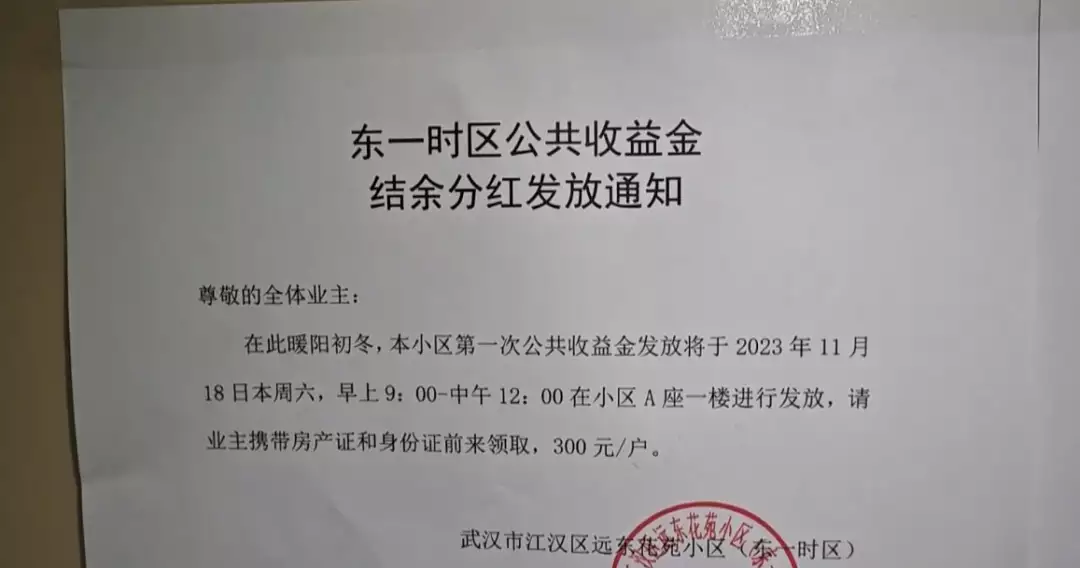 近日武汉一小区业委会拿出10万元现金给业主们发红包业主们纷纷为小区业委会点赞今天(11月18日)上午,在武汉远东花苑东一时区小区,业主凭房产证和身份证现场领取分红。