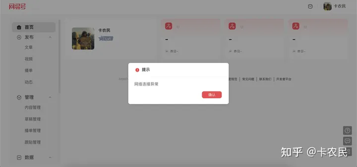 网易号每次都是显示网络连接异常,首页数据为「-」,反馈无用,其他正常优点:1⃣️ 百度、微信内可以搜索到2⃣️ 用户评论活跃缺点:1⃣️ 开通广告收益有门槛2⃣️ 有评论无数字标识通知3⃣️ 每次打开都显示「网络连接异常」。