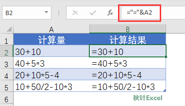 操作步骤:❶ 先在【B2】单元格输入以下公式并填充到【B5】:="="&A2