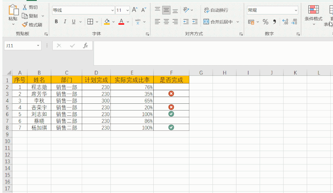 当E列的完成率等于100%时,就会出现O 里画 √符号,且当前行会自动变色;当完成率≤50%时,则会出现O里画×的符号。下面是制作方法,一起来看看吧!首先,我们在F列输入=E2。