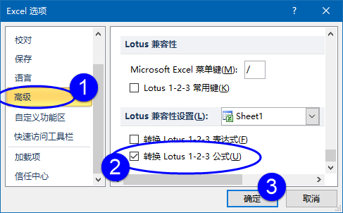 其实很简单,先依次单击【文件】→【 选项】,打开【Excel选项】对话框,然后在【高级】选项卡下勾选“转换Lotus 1-2-3 公式”