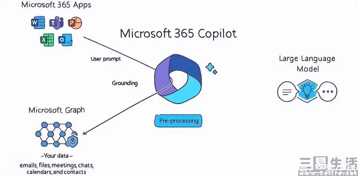 Microsoft Graph则是一个API,应用可通过Graph来查看用户的日历、电子邮件、聊天、文档、会议等数据在经过了这一汇总后,Copilot则位居中枢用户使用自然语言输入,经Copilot转换,与Microsoft Graph的数据连接,再由LLM去理解人类发出的请求,并返回输出结果,Copilot进而根据返回的输出,来调取指令生成最终呈现在用户眼前的内容。