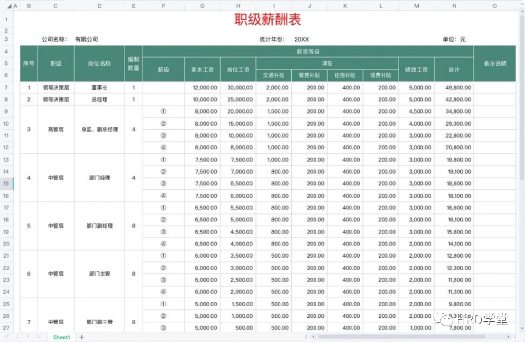 关注【HRD学堂】公众号更多关于制度、体系、流程、岗位、模板、方案、工具、案例、故事、图书、文案、报告、技能、职场、咨询、培训等内容,HRD学堂15年积累与您分享!HRD学堂已经给大家整理了《职级薪酬体系设计(方案+标准+表格+名企案例)