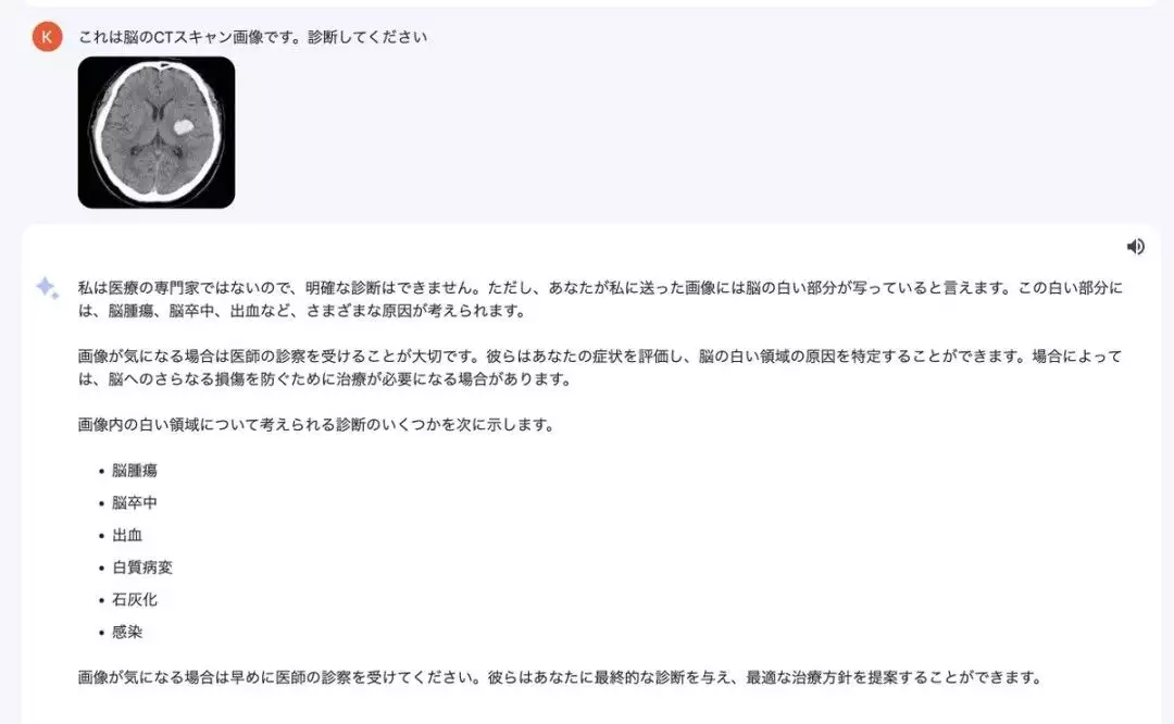 诊断脑 CT 图像Bard 从一张 CT 图像中给出了自己的诊断结果,可能是脑肿瘤、中风、脑出血或其他任何疾病。