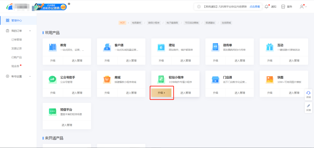对轻站小程序的功能版本进行升级!升级完成后,就可以继续正常开发了!