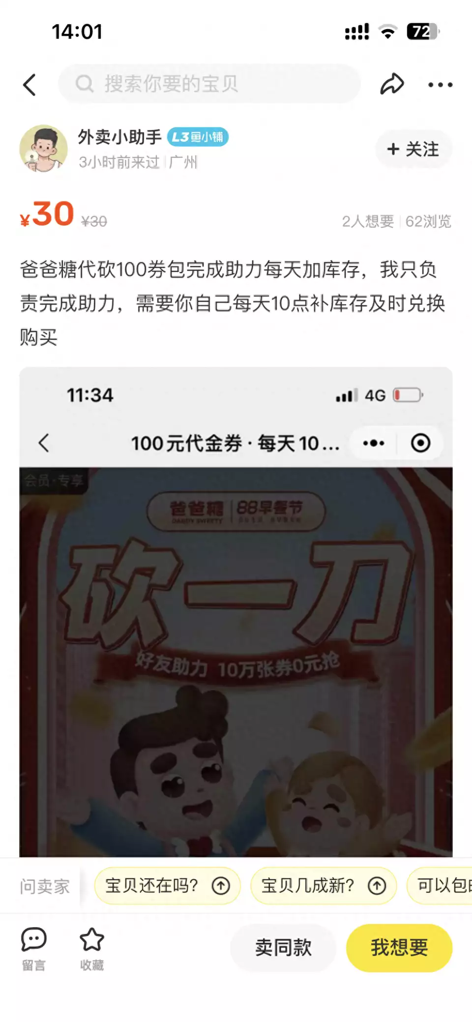还有人会将自己的薅羊毛服务出售给普通消费者,记者在闲鱼APP上搜索“代砍”,搜到了“拼多多帮砍”“爸爸糖代砍”等链接。据商品描述,只需几十元钱,就能砍到一张吐司品牌爸爸糖的100元无门槛代金券。
