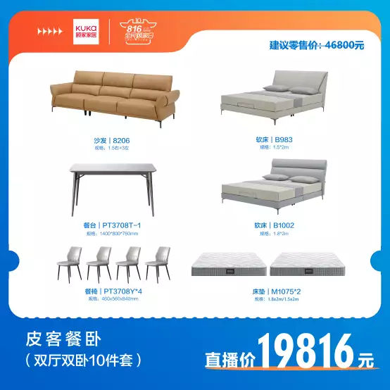 以皮艺客厅餐厅卧室(双厅双卧10件套)套餐为例,零售价46800元,直播间套餐价19816元!近期有购买家居用品需求的消费者,一定提前预约直播间。