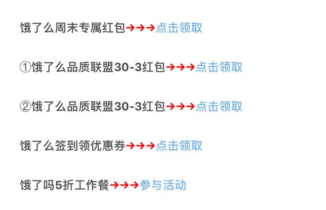 外卖红包优惠券合集美团外卖+饿了么外卖红包优惠券合集,5-35元,每天可领!1注意:如活动失效,可通过下面的二维码关注我们,后续小编会会推送最新活动信息给大家!饿了么活动①饿了么2~31元品质联盟红包,每天都可领一次,建议收藏并分享给经常点外卖的小伙伴