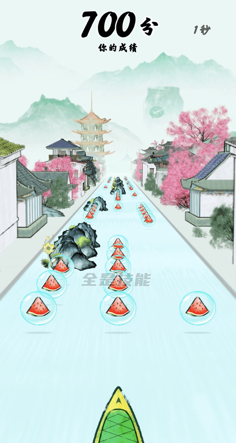 本次游戏的玩法和端午期间推出的赛龙舟游戏基本一致,通过控制赛艇左右移动,躲避障碍物,吃到西瓜等道具即可得分。