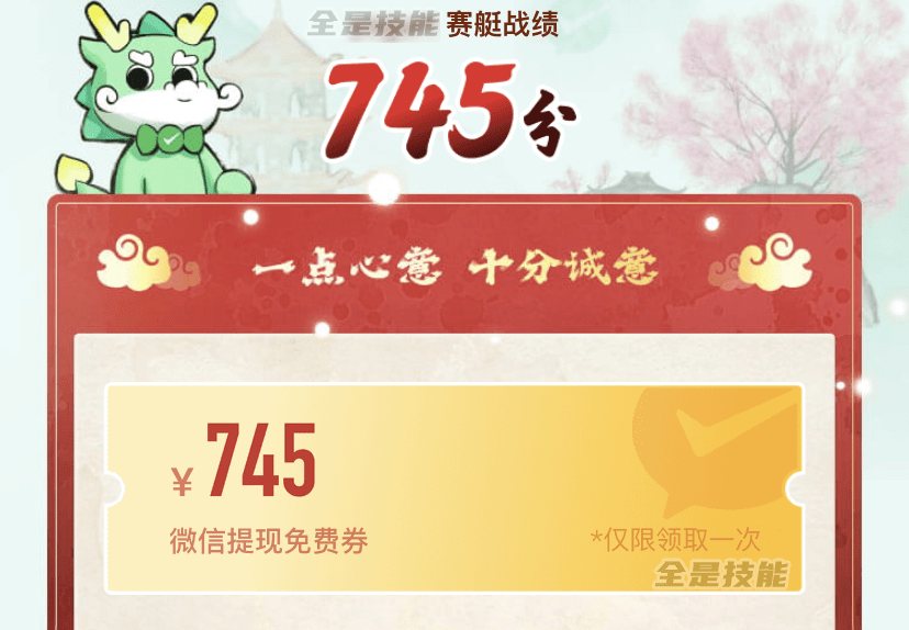在限定时间内,通过“赛艇”游戏获得的分数,即可获得同等额度的提现免费券,每个用户只能领取一次。