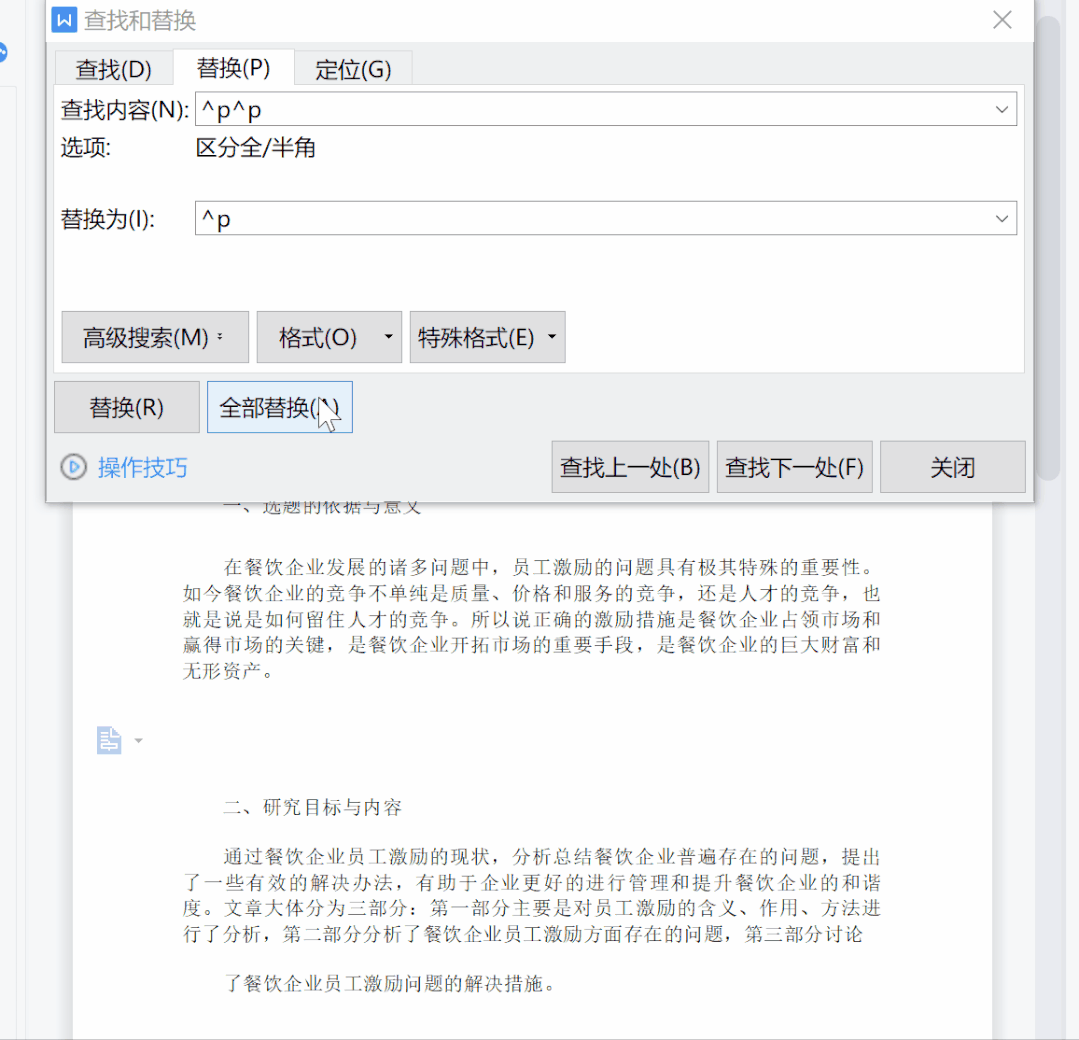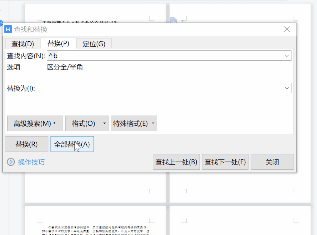 4.Ctrl+H批量删除 先来说一说批量删除空白页按住【Ctrl+H】后点击【特殊格式】中的【分节符】替换那里,不用填任何东西。