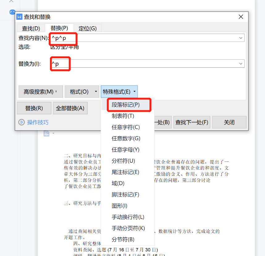 5.批量删除空白行 接下来再附赠大家一个批量删除空白行按住【Ctrl+H】后点击【特殊格式】中的【段落标记】“查找内容”加入2个【段落标记】“替换为”加入1个【段落标记】