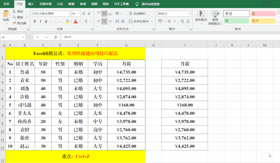 方法:选定目标单元格,Ctrl+C复制,然后用Ctrl+V粘贴即可。七、Excel工作表快捷键:Ctrl+Z。功能:撤销操作。
