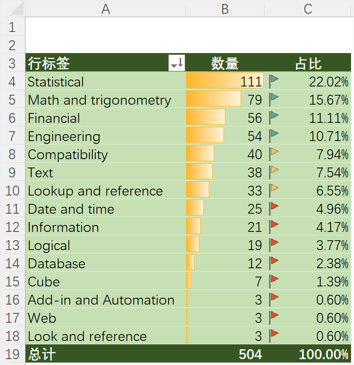 经过简单的拖拉拽,我们得到这样一个按函数类别进行统计的带可视化效果的表格我们以前一直说,Excel有几百个函数,到底多少个呢?好像没人较真去数现在数据来了,截止今天的Excel 365版本的函数个数是504个。