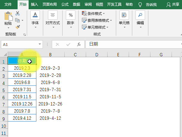 2、不规范日期的整理输入的日期不规范,会给后期处理带来困扰,比如下图2019.2.3这种写法是最常见的不规范日期,该怎么整理呢?