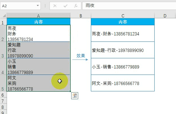 3、按指定内容换行将A列内容根据“-”换行,效果如C列所示: