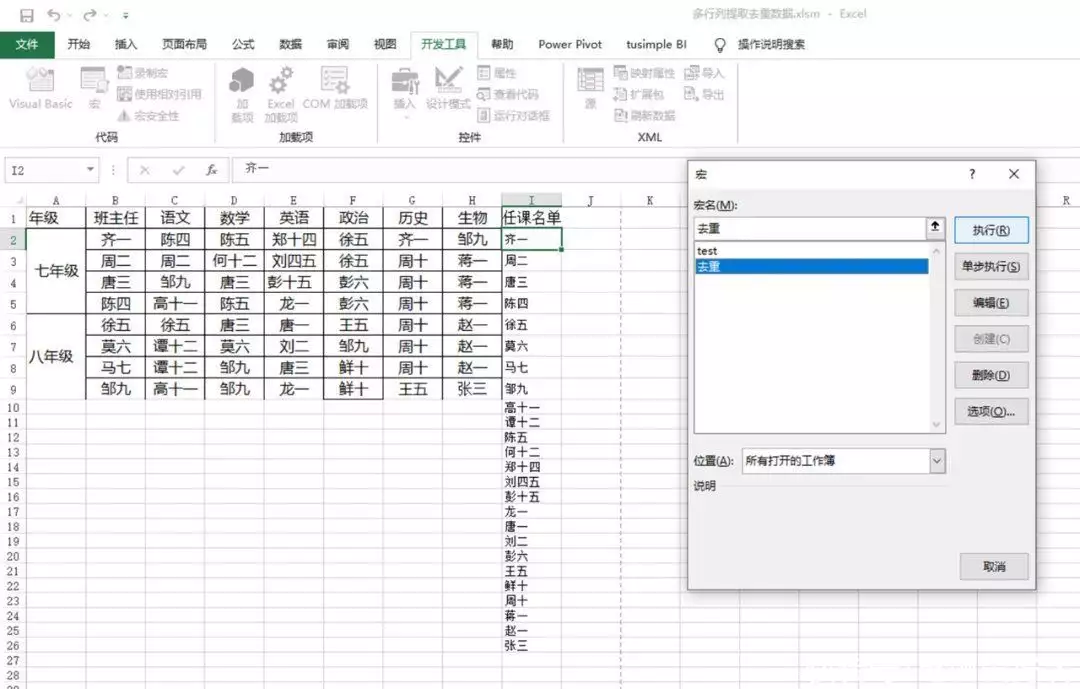 返回到Excel窗口中,依次点击“开发工具→宏→去重”,点击“执行”,这样VBA代码就会将所有老师的数据复制到I列并完成去重操作了(图8)。CF