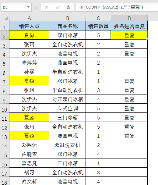 输入公式为=IF(COUNTIF(A:A,A2)=1,"","重复")公式说明:首先使用COUNTIF(A:A,A2)计算出每个姓名出现的次数,当结果大于1就表示姓名重复,进而使用IF函数得到最终的结果。