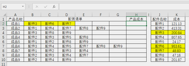 表中有很多种配件,不同的配件组合成一个个成品,相同配件在一个产品中只出现一次。现在的问题是根据配件成本核算出成品的成本,例如成品1的成本就是200.84+953.61+48.83=1203.28。