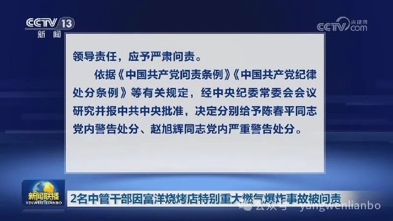 涉事有关企业存在相关违法违规行为事故调查组按规定将在事故调查过程中发现的地方党委政府及有关部门的公职人员履职方面的问题等线索及相关材料,移交中央纪委国家监委追责问责审查调查组7.2名中管干部因富洋烧烤店特别重大燃气爆炸事故被问责。