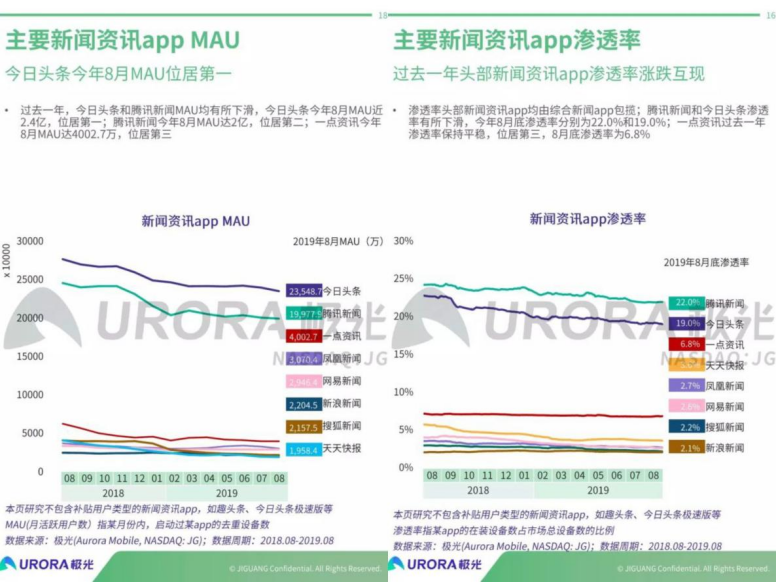 然而从2018年开始,抖快等短视频平台的崛起让新闻资讯类APP的热度有了明显的下降极光大数据显示,从2018年8月,新闻资讯APP的MAU以及渗透率呈现持续下滑的趋势,也是在同年8月,字节跳动总部大楼外的“今日头条”LOGO被“字节跳动”取代,而那一年张一鸣的对外头衔也变成了“字节跳动CEO”。