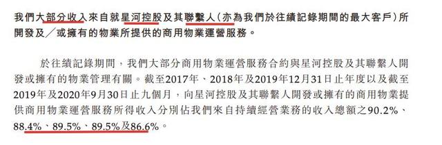 图片来自招股书截屏招股书风险提示,其大部分收入来自星河控股及其联系人开发或拥有的物业,于2017年至2019年年度及截至2020年9月30日止九个月分别贡献人民币2.51亿元、2.91亿元、3.47亿元及2.65亿元,分别占收入总额的90.2%、88.4%、89.5%及86.6%。