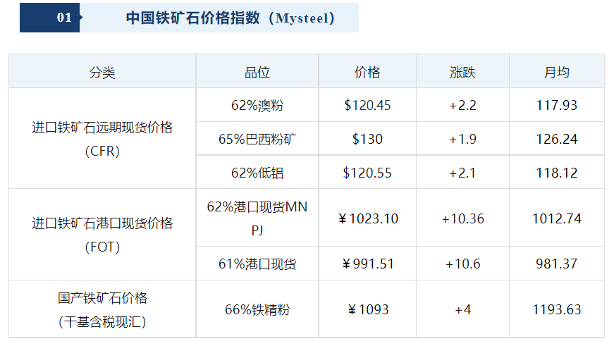 进口铁矿石远期现货价格(美元/干吨)2023-10-16,进口62%品位澳粉远期价格为120.45美元/干吨,环比每干吨上升+2.2美元;当月平均价格为117.93美元/干吨2023-10-16,进口65%品位巴西粉矿远期价格为130美元/干吨,环比每干吨上升+1.9美元;当月平均价格为126.24美元/干吨。