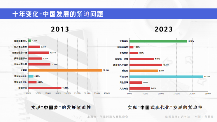 2013年发布的“上海中学生时事关注微调查报告”显示:在回答“要实现‘中国梦’,我们的当务之急是什么?”这一问题时,反腐败(37.54%)高居榜首时隔十年后,在回答“你认为,要如期实现中国式现代化,最需要在_____领域加大投入、加快发展?”上海中学生认为“科技突破”是实现“中国式现代化”的核心要务。