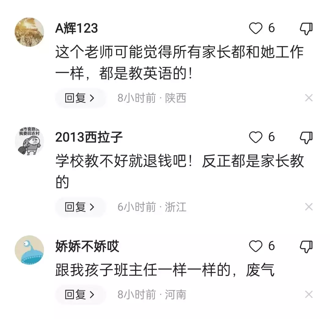 从这位老师说的话和语气就可以感受到,老师是在责怪家长未辅导孩子做好课堂笔记和作业,而且显得很生气对于家长的责怪,家长们则表示,英语水平有限且忙于工作,家里只有老人陪伴孩子,现在被老师责怪,感觉很冤枉!
