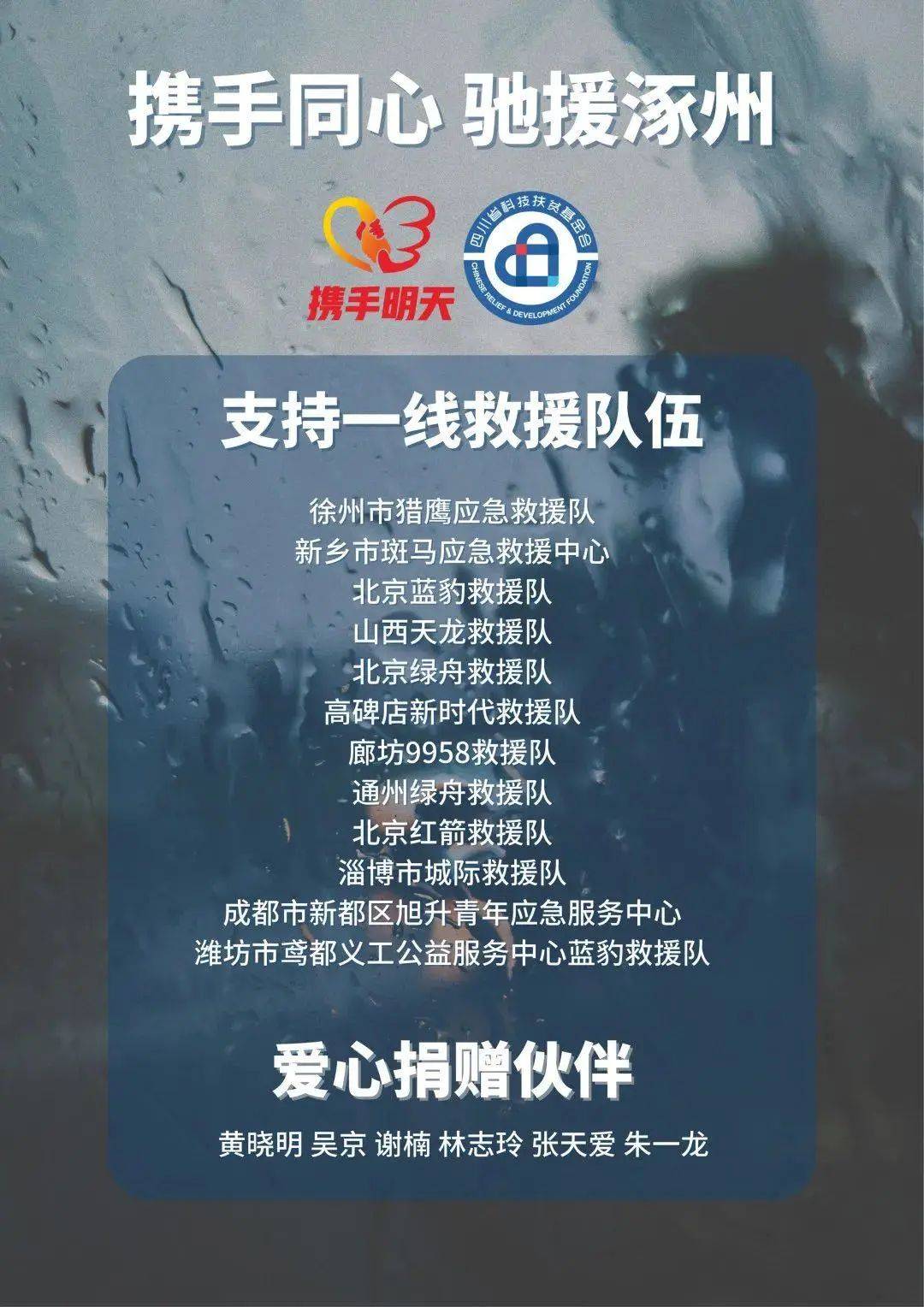 暴雨无情肆虐,洪涝灾害牵动人心。为帮助涿州本次暴雨侵袭受灾群众,中华思源工程基金会联合“携手明天”爱心艺人黄晓明、吴京、谢楠、林志玲、张天爱、朱一龙,支持12支专业救援队伍在涿州受灾一线开展转移群众、安置协助、物资供应、秩序维护等一系列救援工作。