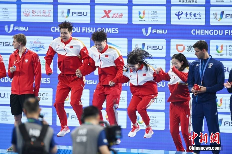 8月2日,第31届世界大学生夏季运动会男女4×100米混合泳接力决赛在四川成都举行,由王谷开来、覃海洋、张雨霏和李冰洁组成的中国队获得金牌。图为中国队运动员在冠军领奖台上。中新社记者 张浪 摄