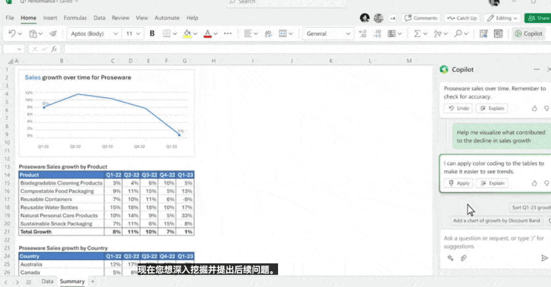 公式用得不熟练?只需点击右上角的图标,把需求交给Copilot就可以了。“左边的一大段数据都反映了哪些关键趋势?” 话音刚落,Copilot就道出了1234。