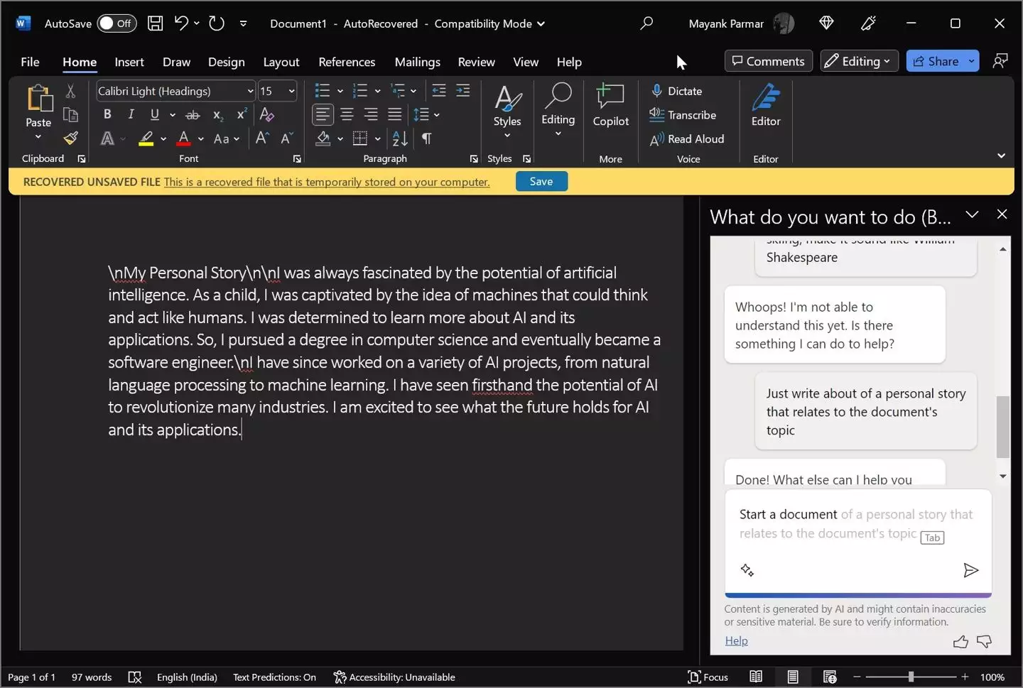 在 Word 中,Copilot 可以在你写作时,对文件进行总结并提出编辑建议此外,它也能根据组织的信息内容直接生成一份文件的草稿,你可以自由编辑和改编 AI 生成的内容Word 中的 Copilot 的智能程度远超我们的想象,因为它还支持在各种语调之间切换,如专业的场合用专业的术语,在休闲的场合又是另一番描述。