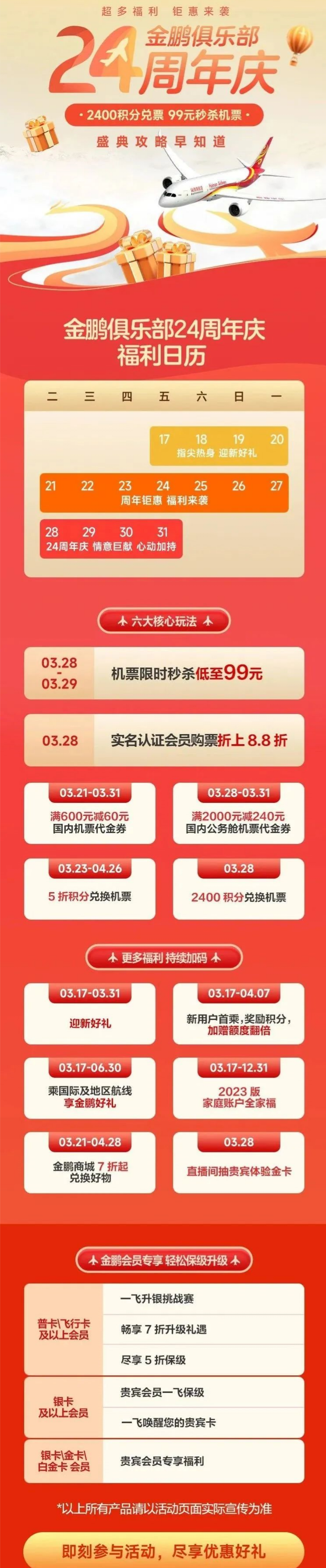 — 5—海航,24周年庆大毛活动活动一、在03月28日--03月29日,机票限时秒杀,低至99元;活动二、在03月23日--04月26日,5折积分兑换机票;活动三、在03月28日当天,2400积分兑换机票。