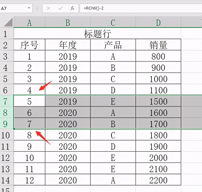 メ我们在A3单元格输入公式=ROW()-2,这个数字2的参数,就是序号1所在单元格的行号减1(例:序号1为A4单元格,公式变为=ROW()-(4-1))。メ