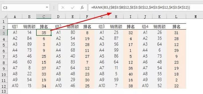 3、多区域排名多列数字要放在一起排名,需要把区域放在括号内。=RANK(B3,($B$3:$B$12,$E$3:$E$12,$H$3:$H$12,$K$3:$K$12))