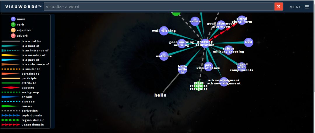 Visuwords 是一个唯美好看的英语单词可视化工具,也是一个新颖有趣的英语单词学习网站它的使用方法非常简单,直接输入一个单词按下回车键就可以;它的功能非常强大,通过一个唯美的树状图形象化这个单词,展示这个单词对应的名词、动词、分词、形容词、副词、属性、实例、近义词、反义词、因果、派生、从属关系词。