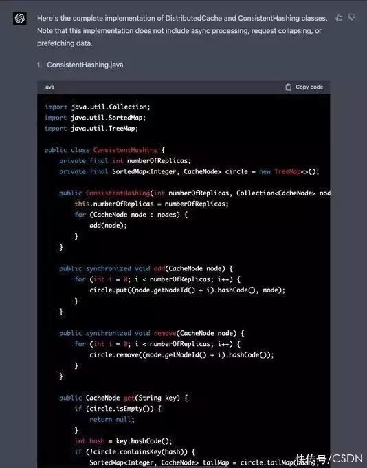 面试环节第二步——上手写代码当问题以不错的结果完成之后,接下来,所谓是骡子是马,拿出来溜溜,由此也进入了程序员岗位最为重要的实操环节——写代码Naman Bhalla 给出的要求是,让 GPT-4 用 Java 编写一个分布式缓存的代码,支持以下要求: