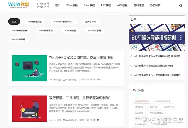 Word联盟在这个学习网站,你能学到很多和Word相关的知识点击其中的【Word教程】,便能看到很多不错的Word课程了,比如如何保存自定义的页眉样式,如何制作双行标题等等直接点击自己想要学习的内容,就能看到详细的图文教程了。