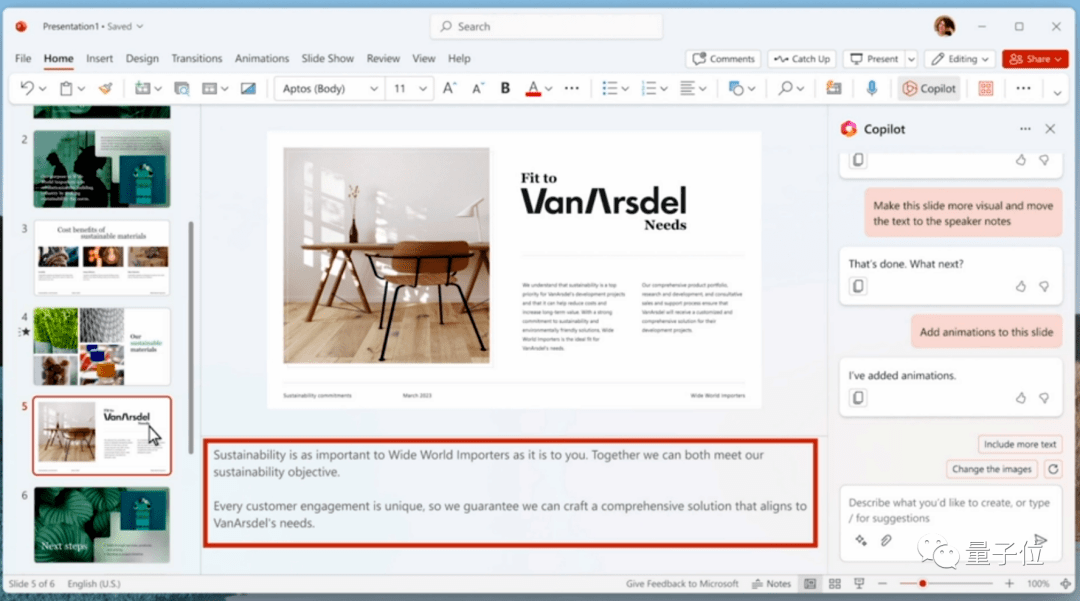 接下来可以用文字命令Copilot帮你修改:简化内容、替换你不满意的图片(可以从OneDrive云盘直接加载图片、添加动画等)。